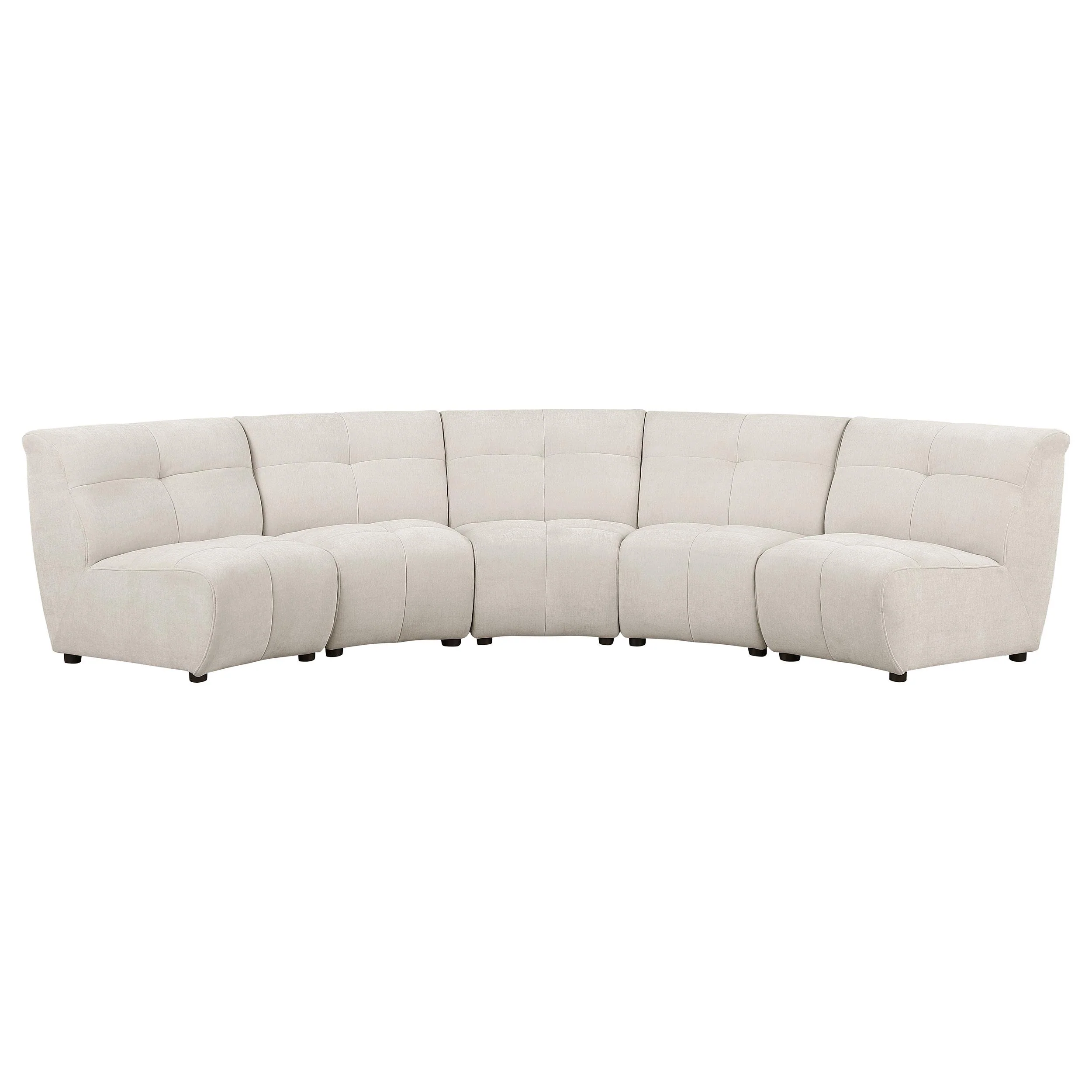 Make a living room or media room the favorite choice for guests and family with a five-piece sectional sofa with minimalism and sophistication woven into its streamlined design. The sectional sofa cuts to the chase with an ultra-comfortable seating experience and subtly rounded profile, perfect for socializing. Durable ivory fabric is soft and inspiring, lending a versatile element to match or coordinate with surrounding décor. This sectional aligns eight armless pieces for a customized configuration and features contemporary design elements with plump, foam-filled framing and decorative tufting adding dimensionality and classic style. A focal point in any space, the sectional sofa accommodates several visitors and adds a low-key, easy motif.